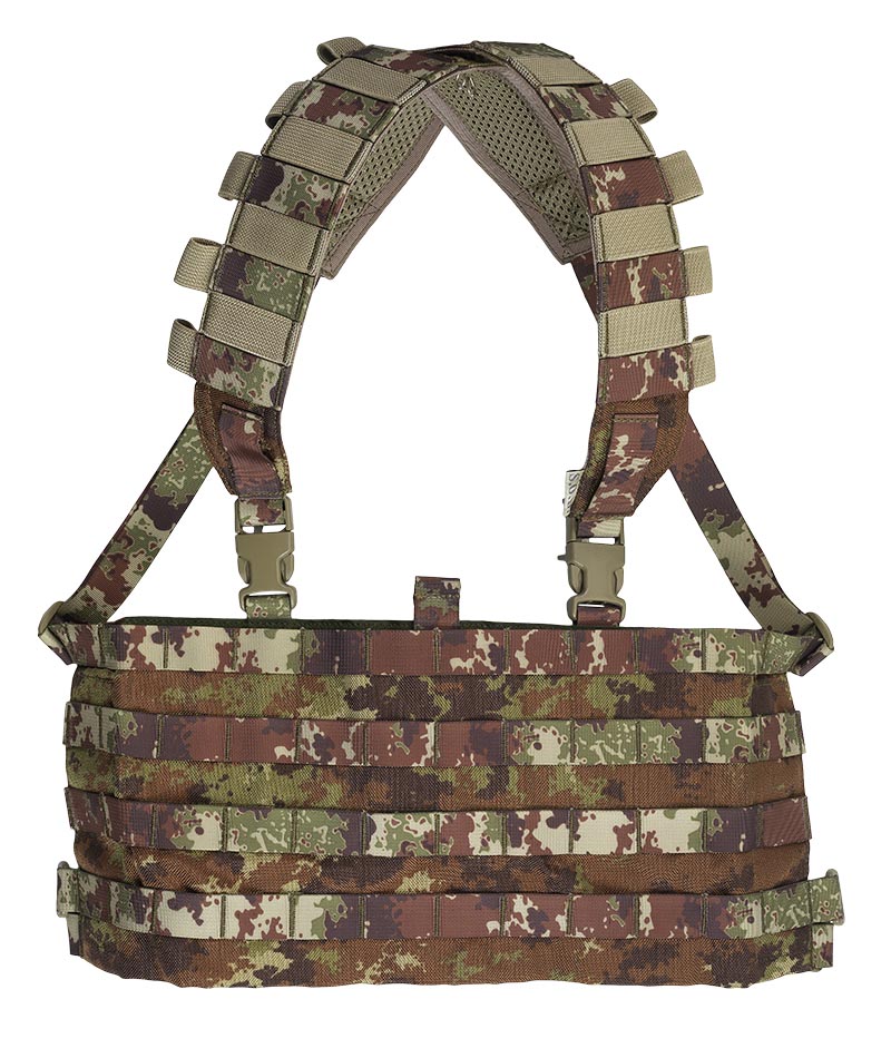 This small Chest Rig is entirely made of Cordura 1000D, the shoulder straps feature a light highly resistant Airnet padding. The front part is totally MOLLE compatible. The upper side is closed by a stretch interface along the entire length. This allows to insert pockets with stretch interface like the internal shingle mag pouch.