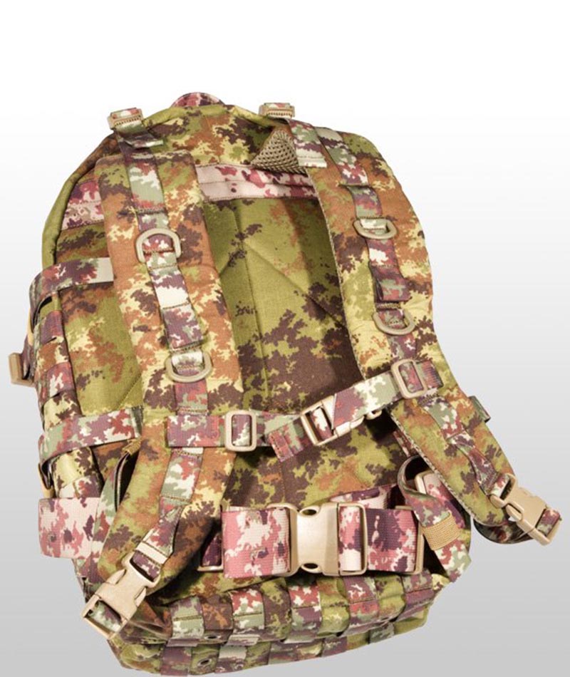 Backpack with a capacity of approx. 40L made of Cordura 1000D, composed of 2 compartments with different characteristics. The first compartment is provided with a pouch to contain the hydration system and with an optional, shaped rigid frame.